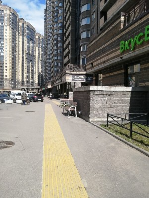 Идти налево от магазина "ВкусВилл" вдоль дома 21 корпус 1 по выделенному пешеходному тротуару с асфальтовым покрытием и тактильными тротуарными плитками.