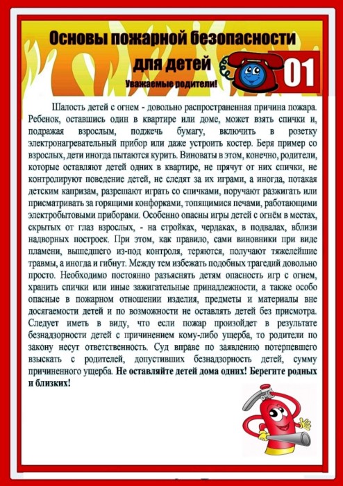 Уважаемые родители, правила пожарной безопасности следует прививать детям с малых лет! В целях вашей безопасности и безопасности ваших детей как можно чаще беседуйте с малышами о том, как себя вести в чрезвычайных ситуациях, разъясните детям возможные последствия и опасность игр с огнем и другими пожароопасными предметами. Как показывает практика, напоминать детям о правилах пожарной безопасности необходимо постоянно, чтобы выполнение этих требований вошло в привычку, стало естественным, не требующим особых усилий.